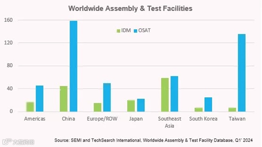 多数美国主要IDM企业的A&T产能分布于海外。而Nvidia、高通、博通、AMD等无晶圆厂设计公司则依赖台积电代工,后者目前主要使用其位于台湾的A&T设施。即便台积电正在美国建设晶圆厂,其在美国尚未建立配套的封装测试产能[k]。