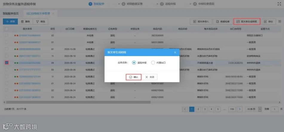 勾选检查通过的数据,点击“报关单生成明细”按钮,根据系统弹窗提示选择对应业务名称,点击“确认”按钮,界面跳转至“生成出口明细”界面。
