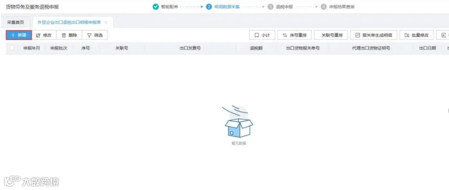 在外贸企业出口退税出口明细申报页面,点击“新建”按钮,页面将弹出采集框。