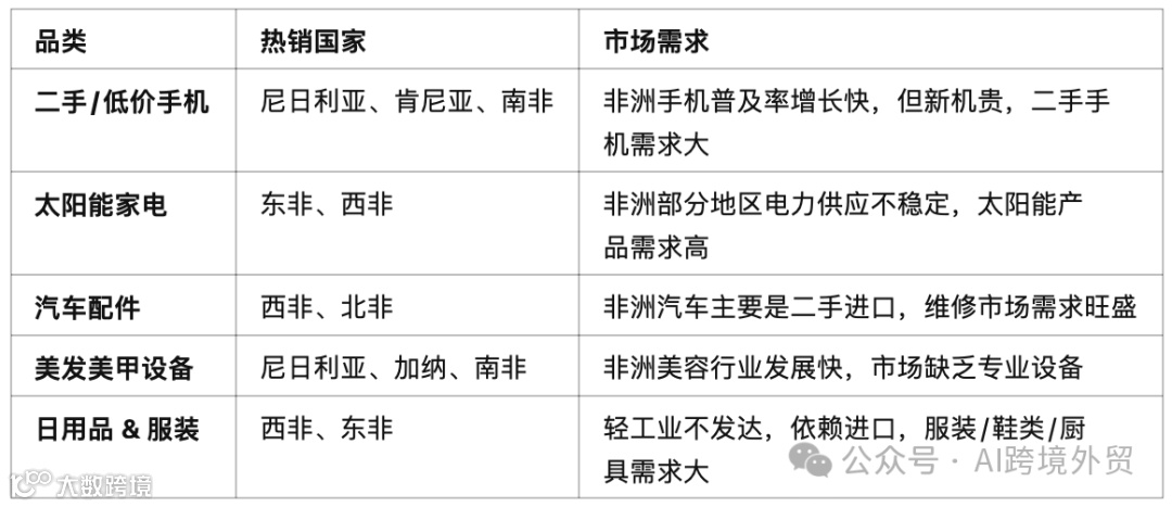 避免“想当然”选品,需基于本地实际需求。非洲市场正处于消费升级阶段,但价格敏感度高,性价比突出的实用型产品更受欢迎[k]。根据调研,潜力品类包括:
