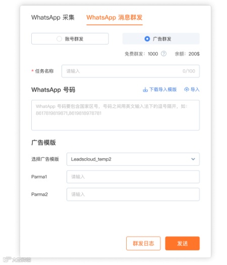 WhatsApp广告账号群发可以通过询盘云的Chrome浏览器插件询多多来完成。如下图,输入WhatsApp号码列表,选择要发送的模板消息,点击发送即可。