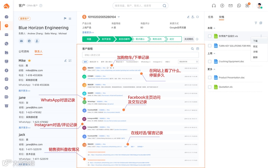 就好比客户到了你这,询盘云给这个客户打个标记、装个追踪器,让你知道TA的行踪:来了几次网站,看了哪几个页面,打开了几次报价单,邮件打开了几次,因为什么给你发的WhatsApp……从而帮你把你的“地盘”划出来,让你更容易把客户拿下。