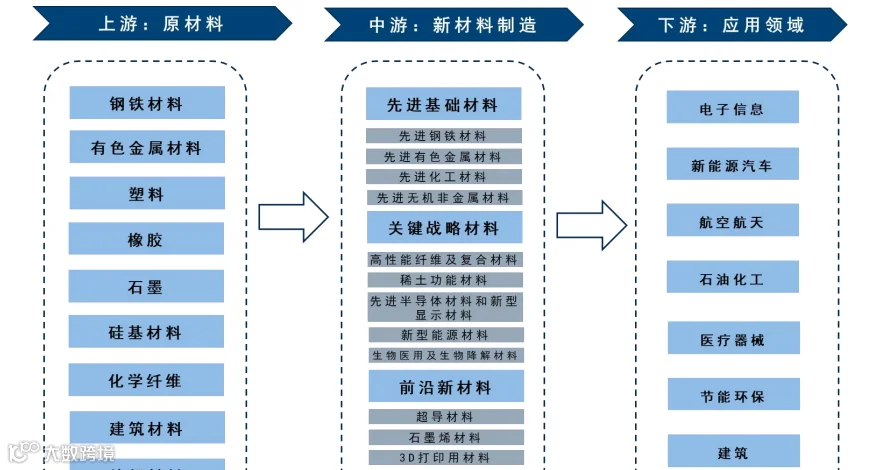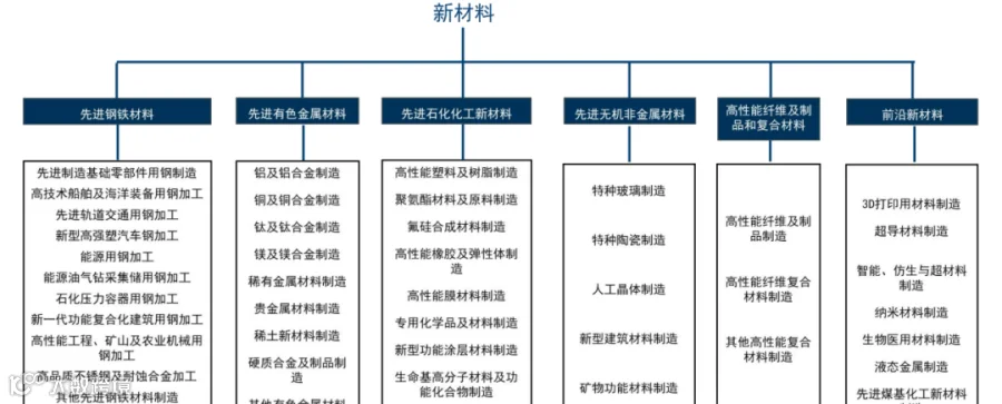 中游:主要分为先进基础材料、关键战略材料和前沿新材料;