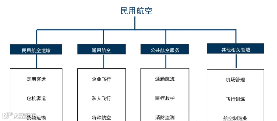 民用航空它涵盖航空运输、通用航空以及相关的航空制造与维修等多个领域。其中,航空运输以定期或不定期航班的形式,提供旅客和货物的运输服务;通用航空则包括公务飞行、私人飞行、医疗救护、空中巡查、农业喷洒等多种应用形式。