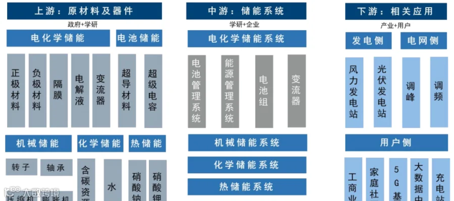 新型储能产业上游为各类原材料及器件,主要有储能电池、储能变流器、电池管理系统、能量管理系统、空气压缩机、换热器、膨胀机等;