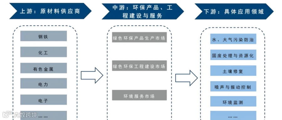 中游:环保产品、工程建设与服务,涵盖绿色环保产品生产市场、环保工程建设市场、环境服务市场等;