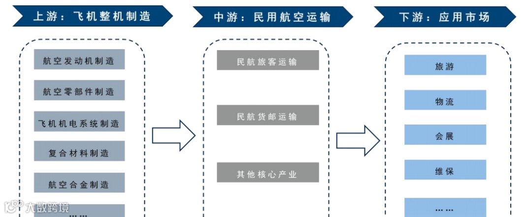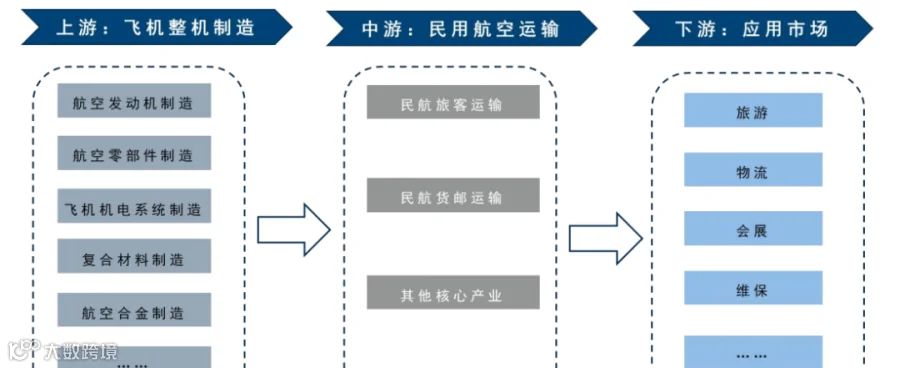上游:主要包括了飞机制造、飞机零部件制造以及飞机材料制造等一系列从原材料、零部件到整机的供应;