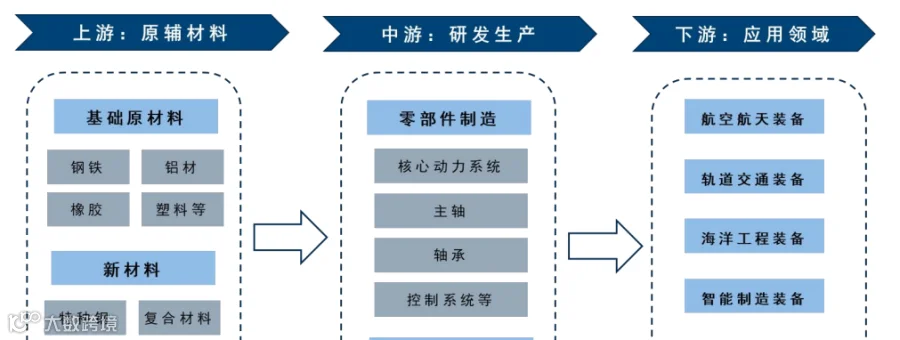 上游:装备制造相关原材料,分为基础原材料(钢铁、铝材、橡胶、塑料等)和新型材料(高强度特种钢、碳纤维复合材料、纳米材料、 特种陶瓷等);