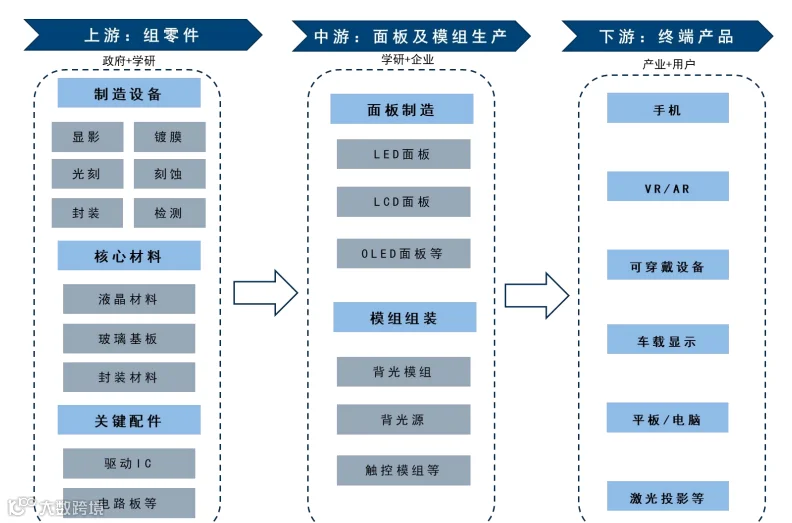 下游为终端产品,包括手机、VR/AR、 可穿戴设备、车载显示、平板/电脑、激光投影等。