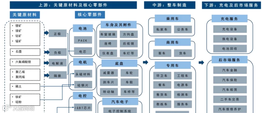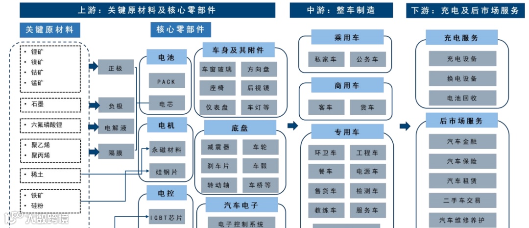 下游:汽车服务,包括充换电服务、汽车后市场等。