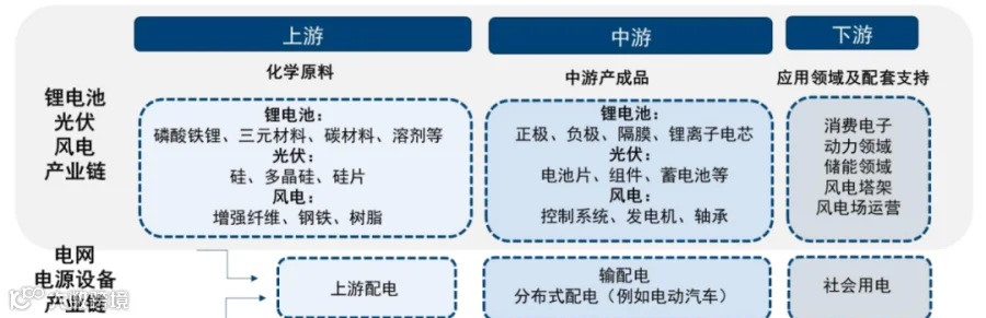 新能源产业链涵盖了从原材料供应、核心部件制造、系统集成、运营维护到最终用户应用等多个环节,涉及光伏、风电、锂电等。