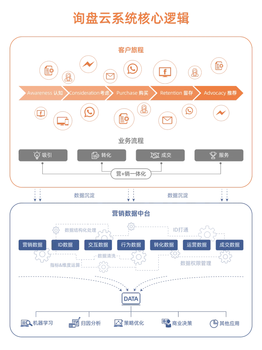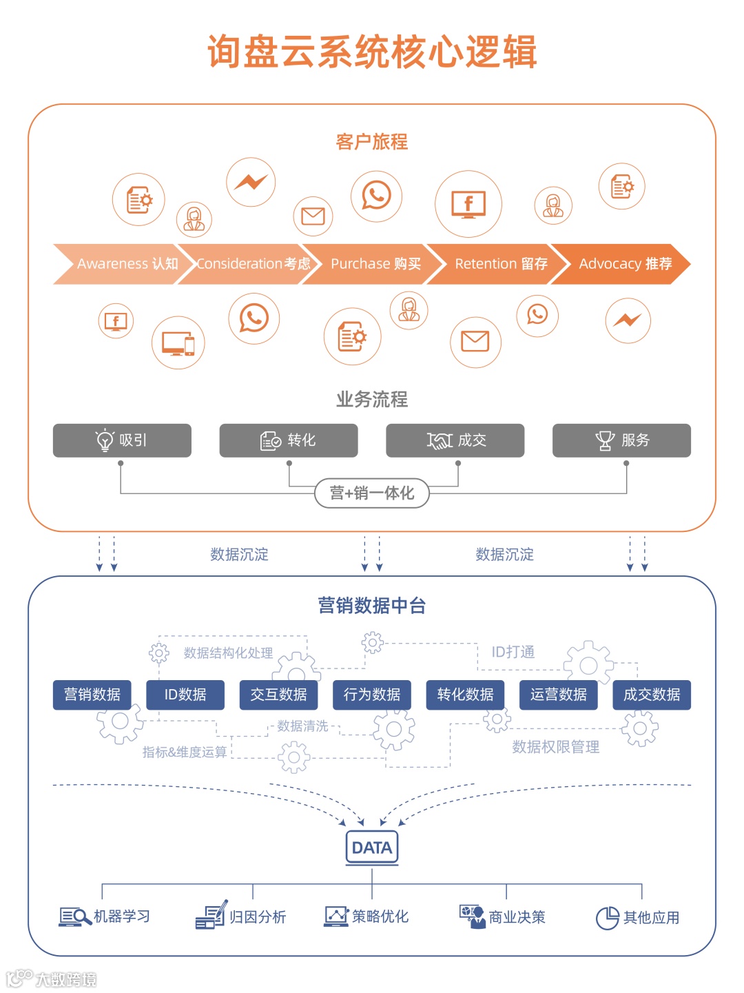 关于这一点,询盘云提出了受众大闭环的概念。受众大闭环指的是:企业通过询盘云Marketing CRM 所累积的数据,找到更多可以成单的客户。