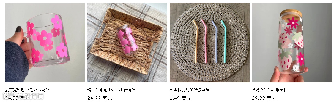 各类玻璃杯、牛奶盒水瓶、牛奶瓶、水杯,售价在12-30美元之间。