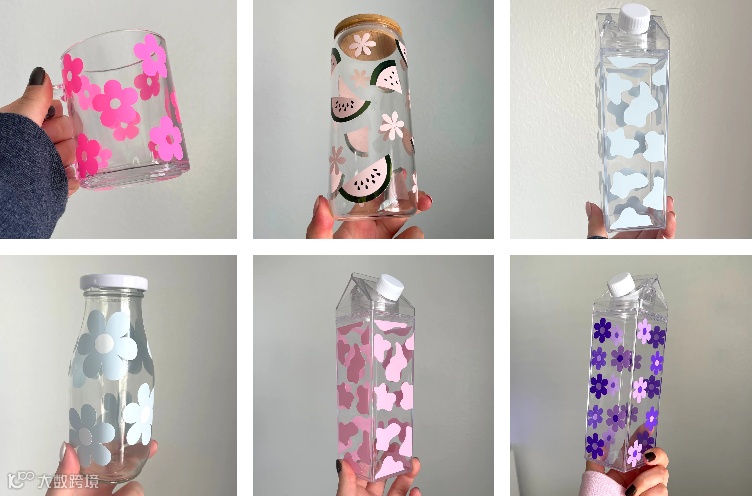 像是发圈和贴纸这些实用类产品,本身就能够满足人们日常生活或个人装饰的需求。而像服装、水杯这一类不仅具有实用性,还可以用作DIY创意发挥的载体。在博主日常的视频中,我们可以看到为玻璃水杯和牛奶方盒水瓶进行图案DIY设计的过程,通过个性化的创作,博主为这些普通的水瓶赋予了独树一帜的个人风格。