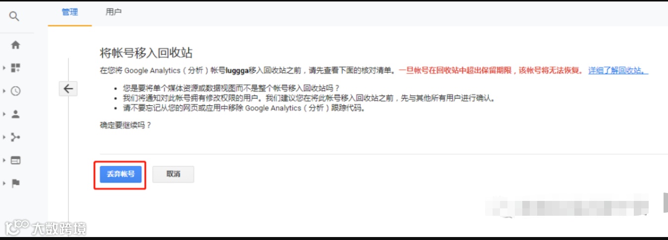 5.请再次确认是否要删除账号。点击丢弃账号,Google Analytics账号便会被删除。