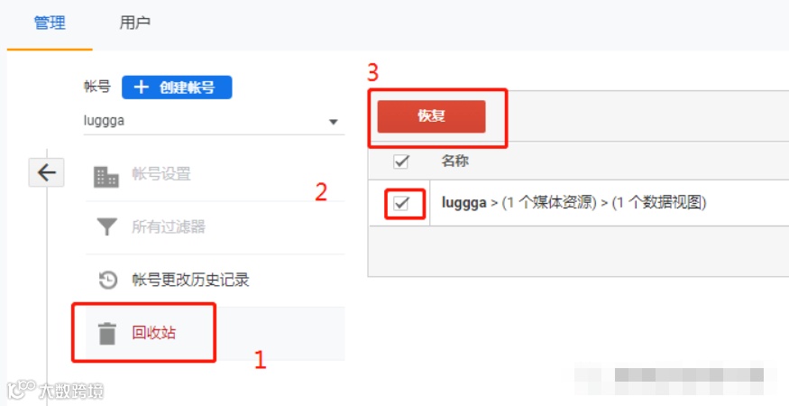 6.删掉的账号会在回收站里保存35天,35天内还可以恢复。如果35天内没有手动恢复,系统会将其永久删除。如果要恢复,请按下图操作。点击回收站>勾选要恢复的账号>点击恢复