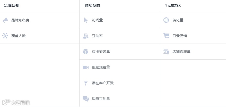 Facebook的广告目标主要有11种,分为三大类:品牌认知、购买意向、行动转化。