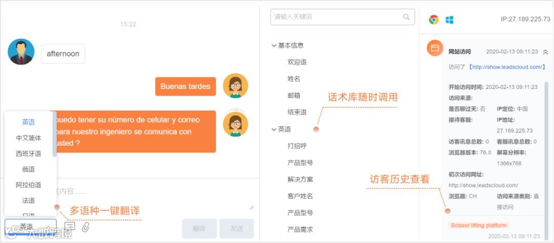 如询盘云在线客服功能可以同时对接搜索引擎和Facebook主页流量,避免了客服来回切换不同软件带来的效率降低;其预设的话术功能,能够有效的提升客服的回复效率;多语种翻译功能,让一个客服可以对接各种语言的客户;在线客服集成录入线索功能,方便客服在对接客户的时候随时录入线索并完成线索分配工作,让销售在第一时间接到客户信息等等。