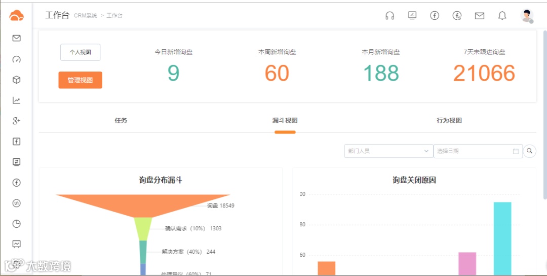 通过CRM,销售也可以清楚地看到自己工作概况,如新询盘数、未及时跟进的询盘数、客户的漏斗分布、日程安排及客户跟进记录等,并可以通过工作台穿透到每一个详情页,了解更详细的信息等等。