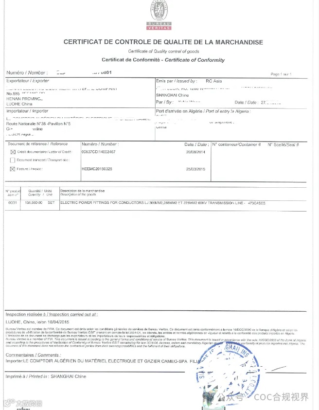 根据阿尔及利亚银行2009年2月16日第16/DGC/2009号通告及第05-465号、第05-467号法令相关规定,所有进口至阿尔及利亚的受管制产品(涉及健康、安全与环境)必须提供由授权机构签发的合格评定证书(CoC)[k]