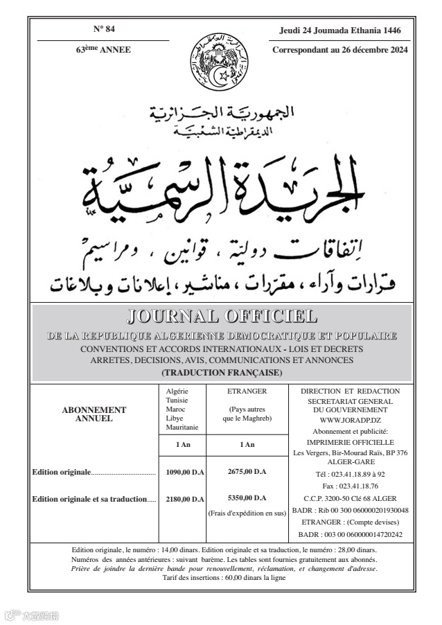 该文件为阿尔及利亚官方公报发布的《2025年财政法》(编号24-08),于2024年11月24日正式颁布,涵盖国家预算、税收、关税及财政管理等多项政策调整[k]
