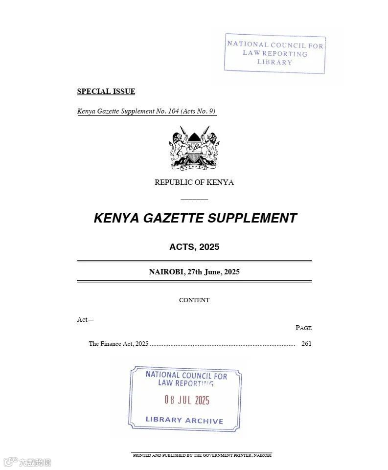 肯尼亚议会于2025年6月27日通过一项综合性税收修订法案,旨在优化财政收入结构并促进经济发展。部分条款自2025年7月1日起生效,其余将于2026年1月1日实施[k]。