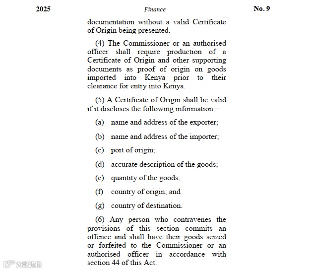 符合性证书(CoC)是肯尼亚强制性清关文件,无此证书货物将被拒入境。特殊情况下,KEBS可在到港后实施检查,但进口商需缴纳CIF货值15%的罚金、15%保证金及检验测试费用[k]。
