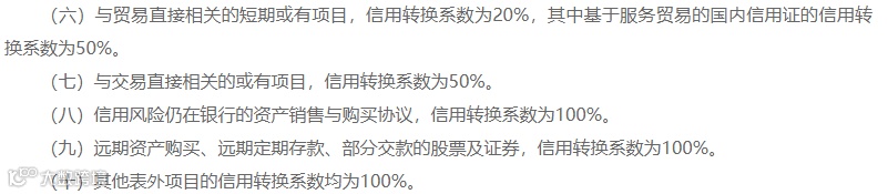 表外项目信用转换系数:等同贷款授信为100%;贷款承诺为40%(可无条件撤销为10%);未使用信用卡额度一般为40%,符合特定条件为20%[k]。票据发行便利为50%;与贸易相关的短期或有项目为20%(国内信用证服务贸易为50%);交易相关或有项目为50%;证券借出、资产买卖协议、远期交易等为100%[k]。