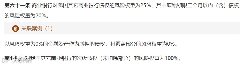 次级债权(不含我国政策性银行)及全球系统重要性银行TLAC工具为150%;我国政策性银行次级债权为100%[k]。金融机构股权投资、依赖银行未来盈利的净递延税资产适用250%风险权重[k]。