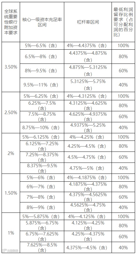 全球系统重要性银行若未满足储备资本、逆周期资本、附加资本或附加杠杆率要求,利润留存比例按更高标准执行,并遵循“孰高原则”确定留存比例。[k]