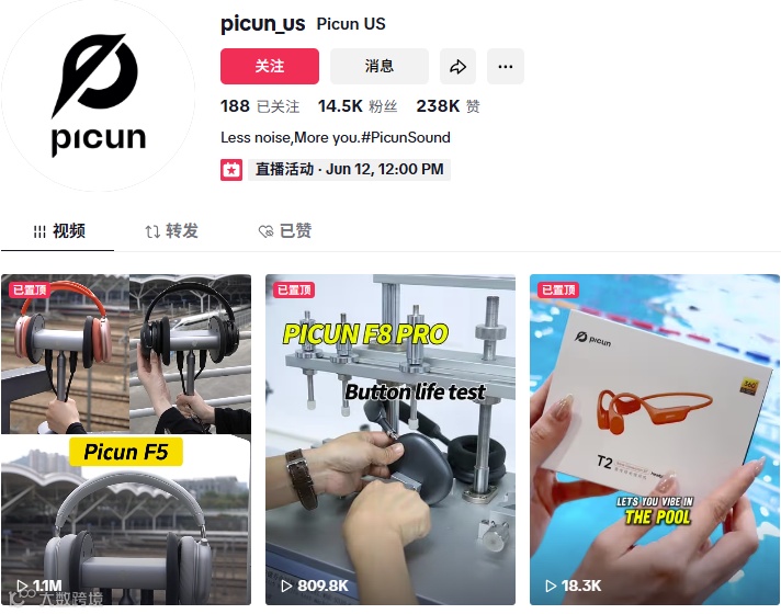 在TikTok上,Picun拥有1.45万粉丝,通过录制纽约中央车站、商场等高噪音环境下降噪对比视频,直观地展示产品的降噪效果;佩戴运动挂脖式蓝牙耳机游泳测评防水性能等,场景化内容直击用户痛点,吸引购买与转化。