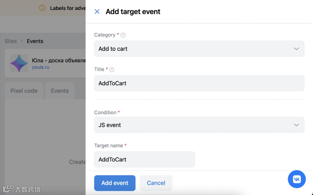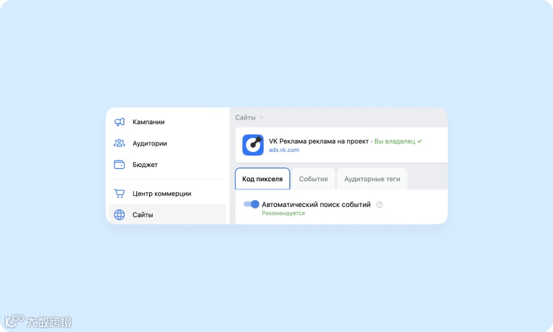 为了让VK广告像素传输有关用户的信息,卖家需要将其添加到网站并设置跟踪事件。