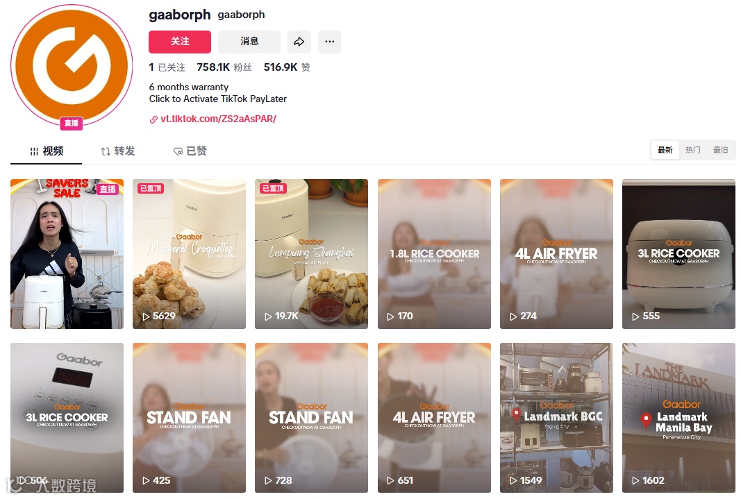 菲律宾TikTok账号@gaaborph拥有75.8万粉丝,越南TikTok账号@gaaborvietnam拥有10.1万粉丝,其@gaaborofficialstoremy账号拥有15.2万粉丝。在Facebook上,Gaabor拥有1.7万粉丝。
