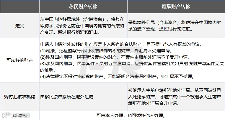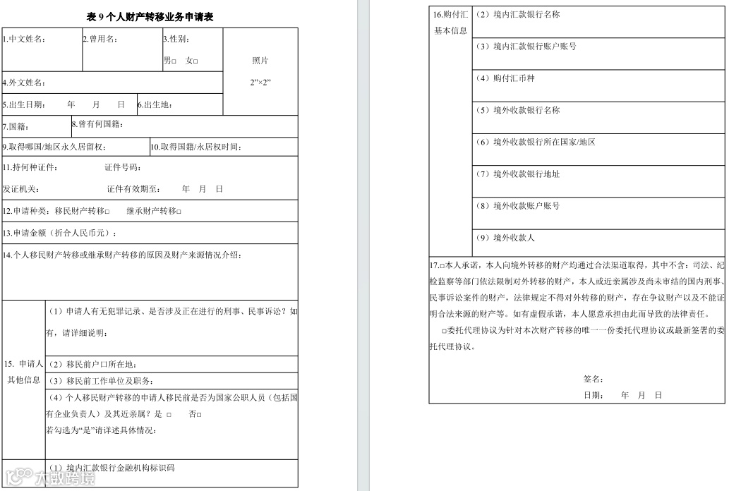 - 《移民财产对外转移申请人情况表》和《个人财产对外转移外汇业务申请表》;