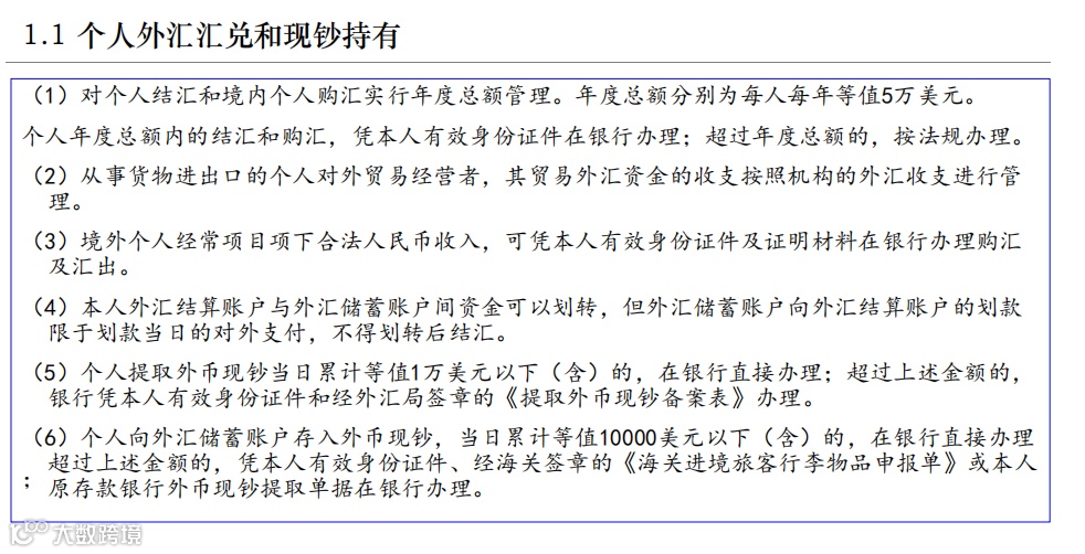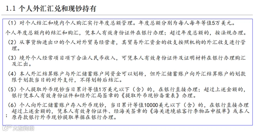 根据《经常项目外汇业务指引(2020年版)》规定,个人结汇和境内个人购汇实行年度便利化额度管理,额度为每人每年等值5万美元,凭本人有效身份证件即可在银行办理[k]。超过该额度的购汇或结汇,需提供真实合法的证明材料。