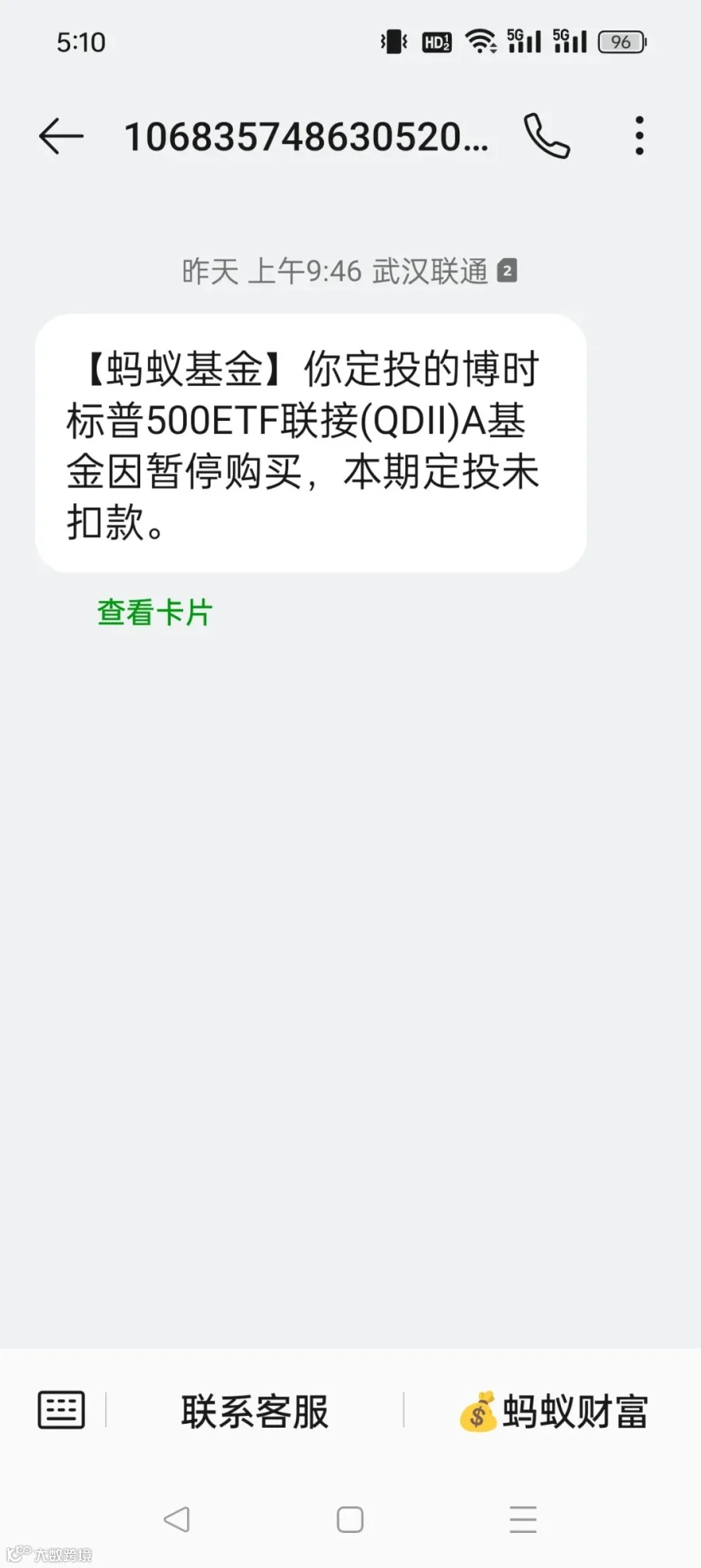 【蚂蚁基金】你定投的博时标普500ETF联接(QDII)A基金因暂停购买,本期定投未扣款。