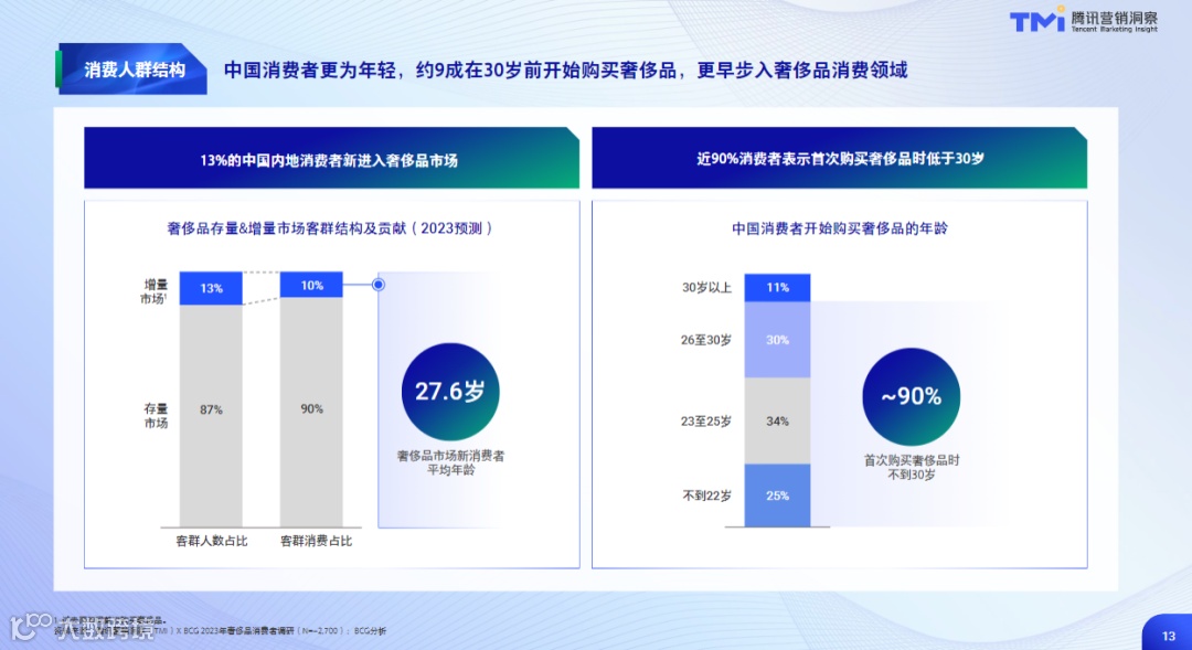 根据腾讯营销洞察(TMI)发布的《中国奢侈品市场数字化趋势洞察报告(2023年版)》预计,2023年中国奢侈品消费市场的年龄结构出现了进一步年轻化的趋势,30岁及以下的客群占比近50%,有约九成消费者在30岁以前开始购买奢侈品。