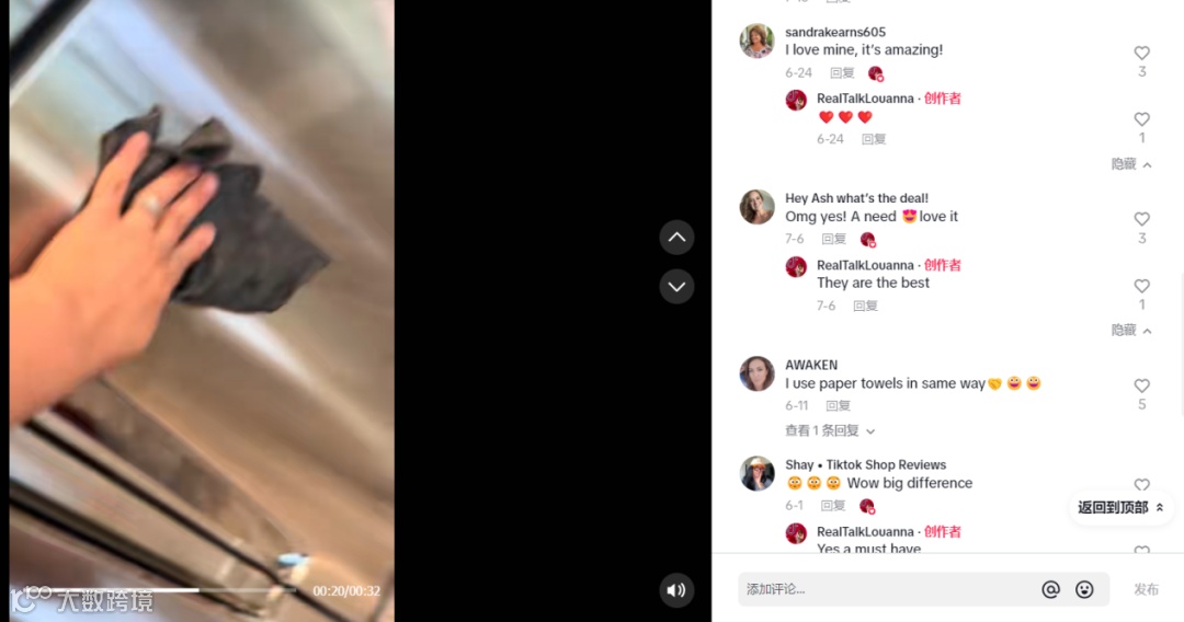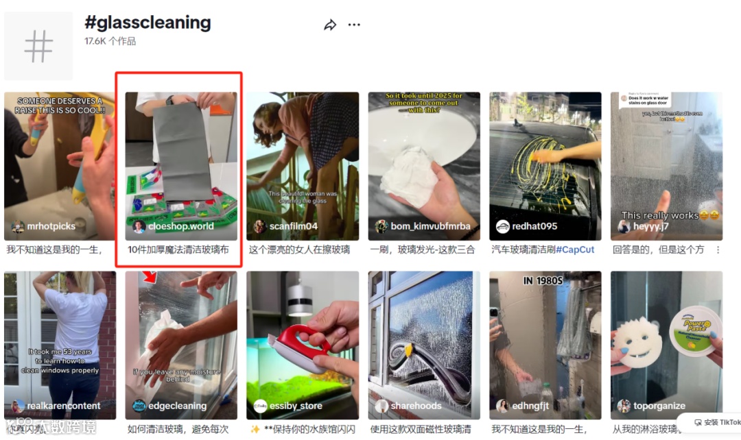 从内容层面来看,TikTok 上关于清洁主题的视频热度不断上升。以 #glasscleaning 为例,该标签在美区TikTok上已有超过17600条作品,各类“抹布对比”“打扫整屋”“一布搞定”的清洁视频层出不穷。相比快节奏、高客单的美妆、穿搭类目,家居清洁属于典型的低价高频消费场景,天然适配TikTok用户的日常生活需求。