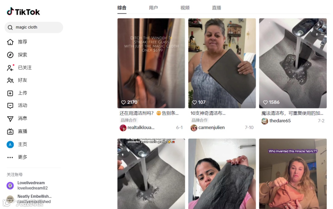 答案在于商家提前布局了TikTok的关键词搜索流量池,同步投放关键词“magic cloth”“magic cleaning”“glass cleaning”,抢占搜索结果页靠前位置,通过锁定主动搜索场景下的高意向客群,实现转化效率的提升。