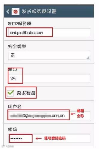 - 设置发送服务器(SMTP):smtp.alibaba.com[k]。