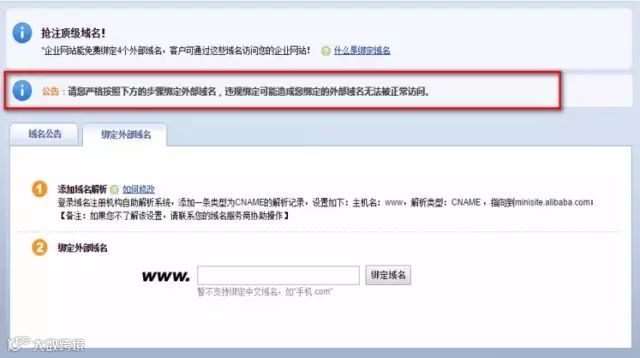第一步:登录域名管理后台,添加CNAME记录,指向minisite.alibaba.com(注意:非旺铺地址,仅为该固定值)[k]。