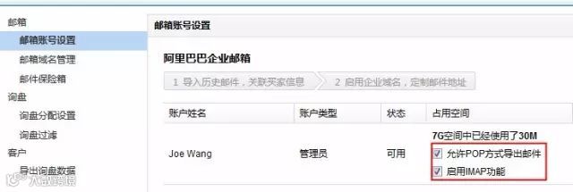 前置条件:确认My Alibaba后台中已开启POP/IMAP功能[k]。