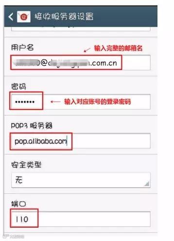 - 设置接收服务器(POP):pop.alibaba.com[k]。