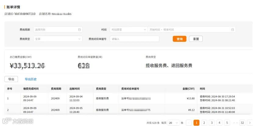 2.通过账号及密码登录进去之后,可以在首页切换店铺。在右上角履约中账单,点进去可以查询全部店铺的物流扣费情况。平台上门取件物流费,即货物运送至temu国内仓的头程运费。单个店铺可以点进详情去查看,按月整理出来做附件。按此明细金额向temu平台小二申请开票,该金额跟账务明细即资金流水账单中的仓储物流费金额要一致,因为平台物流扣后台货款,所以会出现在账务明细中。与此有区别的是,速卖通的上门揽收物流费,是通过另外绑定的支付宝进行小额免密扣款,而不是扣后台货款,所以不影响后台到账金额,上门揽收费不会出现在后台资金账单中。