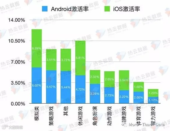在排除了作弊点击的影响因素之后,买量游戏中Android和iOS的平均激活率为:3.68%和3.40%,Android的平均激活率略高于iOS,区分游戏类型来看,模拟类游戏的激活率高于所有其他类型的游戏,但模拟类游戏数量较少,而买量最多的角色扮演游戏的Android和iOS的激活率分别为:3.29%和2.32%,详细数据如图所示:
