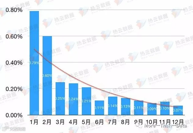 在不应用防作弊规则的情况下,用点击除以激活得到的激活率数据指标下降明显,从1月份的平均0.79%下降到12月份的0.07%,下降了10倍,主要是由于今年出现的大量刷点击的广告平台导致的,7月份我们分享过一个数据,刷10000次点击可以抢到4个归因,具体关于点击作弊的问题,可以翻看我们之前的文章,每个月的平均激活率如下图: