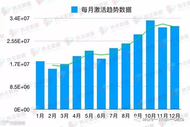 如果看投放产品的数量从年初到年底增长了3倍,那么从激活数据看,从1月份的1700万到年底12月份的3100万增长约2倍,说明“狼多肉少”的现象很明显,抢量竞争还是非常激烈的,11月份的电商季对游戏行业投放造成了一定影响,而12月份激活量有所回升。