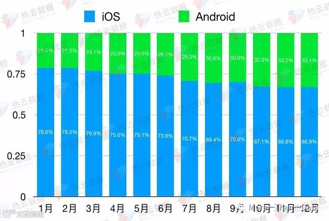 Android游戏的投放比例占比持续增加,从年初的21.5%增长到了年底的33.1%,随着iOS的用户获取成本越来越高,而Android的联运渠道也越来越集中,这个比例还会持续增加,如下图: