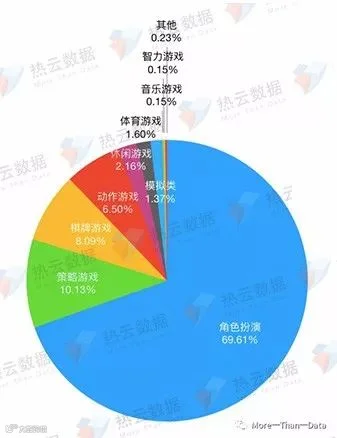从2017年全年的数据看,买量游戏主要还是以角色扮演产品为主,占所有买量产品的69.61%,其次是策略游戏占全年买量游戏比例的10.13%,另外今年有不少地方棋牌的产品也加入到了买量的队伍中,占所有买量游戏的8.09%,然而随着国家政策的管控,一线的广告平台和媒体对棋牌产品的投放管理都很严格,如下是不同类型买量产品的占比情况: