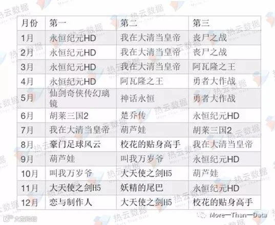 除了腾讯网易的产品以外,今年还是有大量优秀产品赚的盆满钵满的,每个月基本都有非常不错的产品出现,如下列举了TrackingIO监测的产品从1-12月份各月综合因素排名的TOP3的产品: